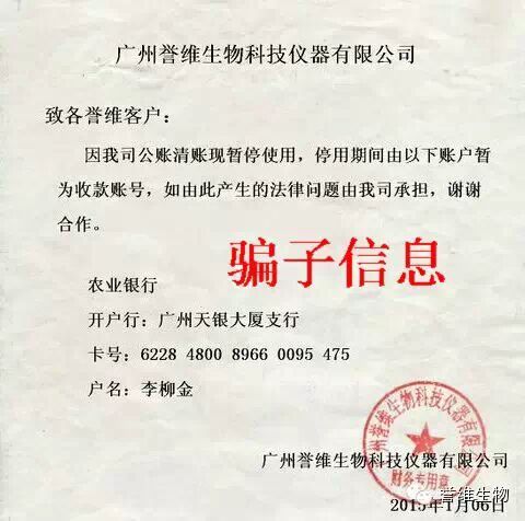 各位合作伙伴:近有騙子盜用我公司同事QQ,把QQ里面某些客戶刪除后又重新用其他QQ添加回來,同時發以下信息給客戶,說是我們譽維原來的賬號暫時停用,付款需要轉賬到新的銀行賬號. 在此提醒各位合作伙伴,如果有收到QQ發送的銀行賬號變更事宜,請電話聯系確認,以免發生上當受騙事宜!